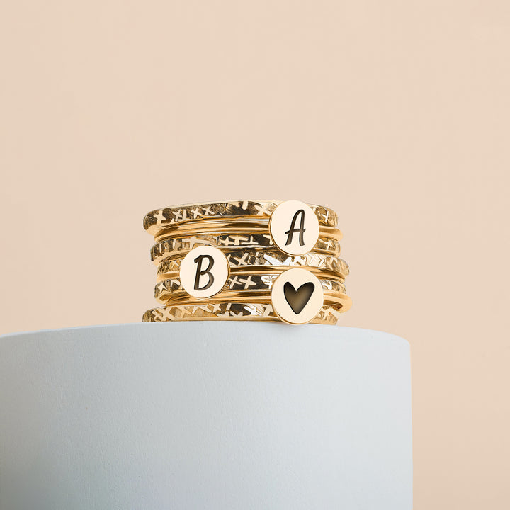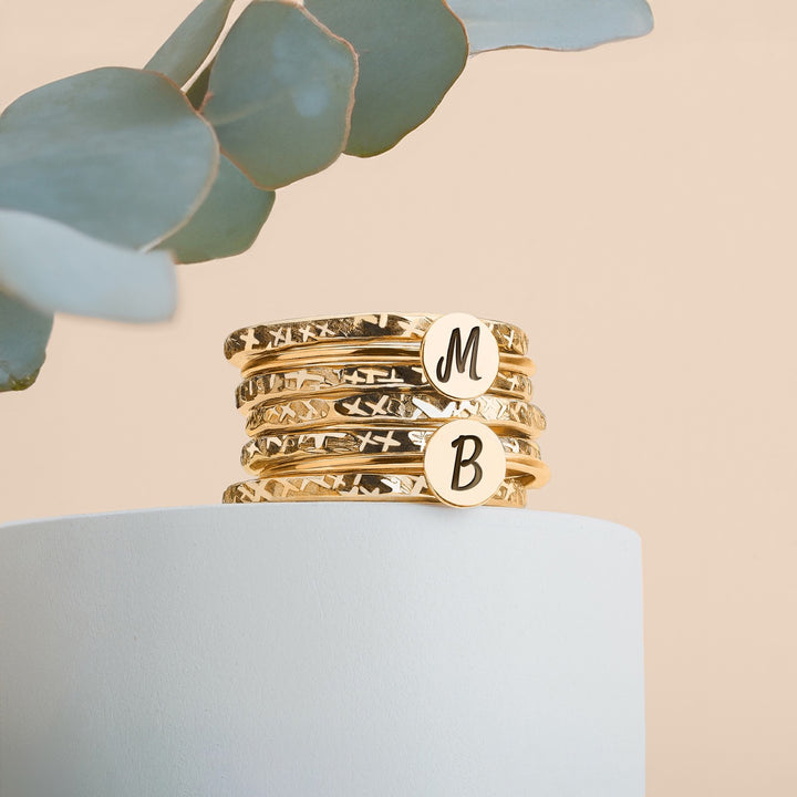Stackable Initial Rings | Personalized Letter Monogram Stacking Family Rings | 3 Initials, 8 Ring Set | Gold, Silver Or Rose Gold
